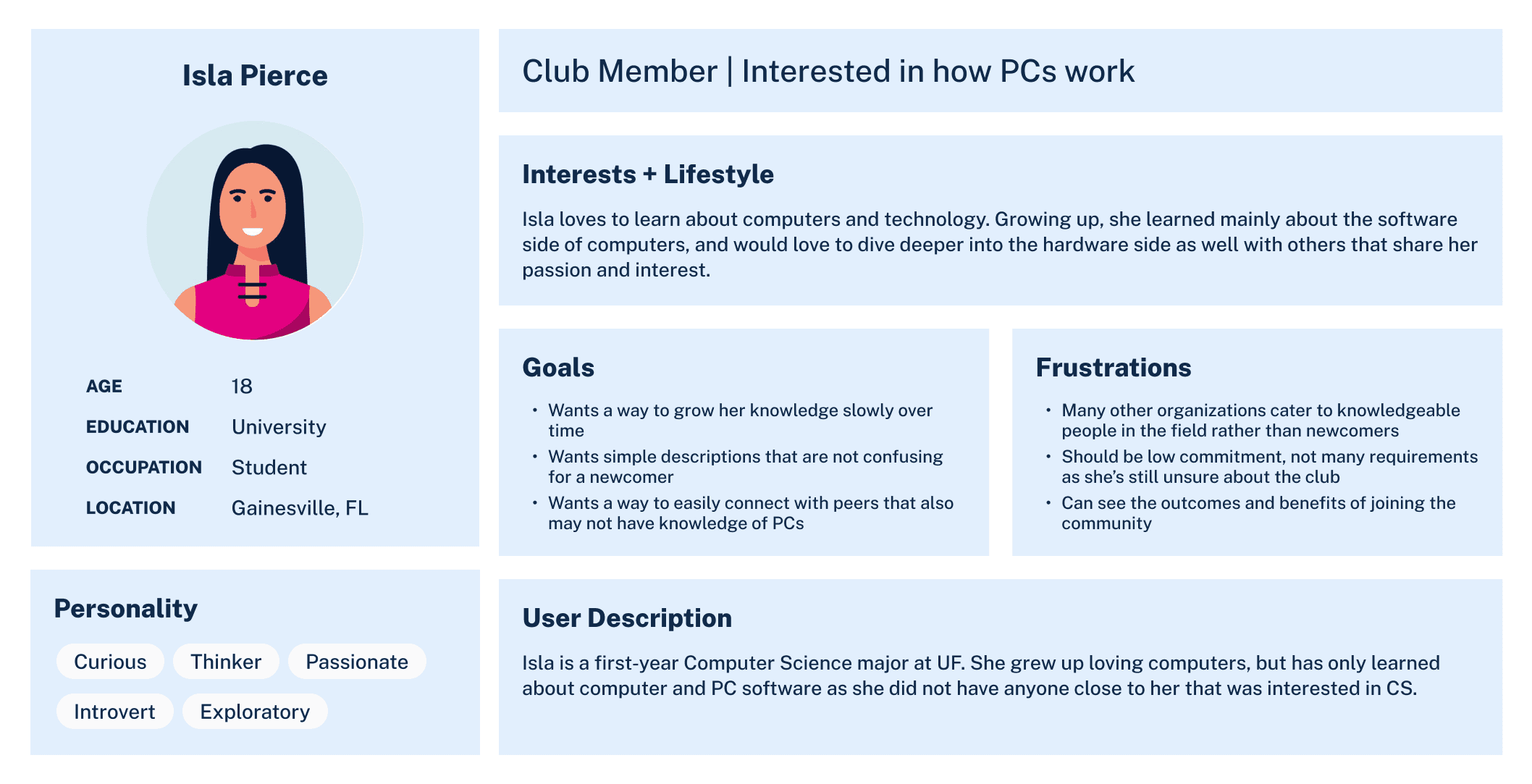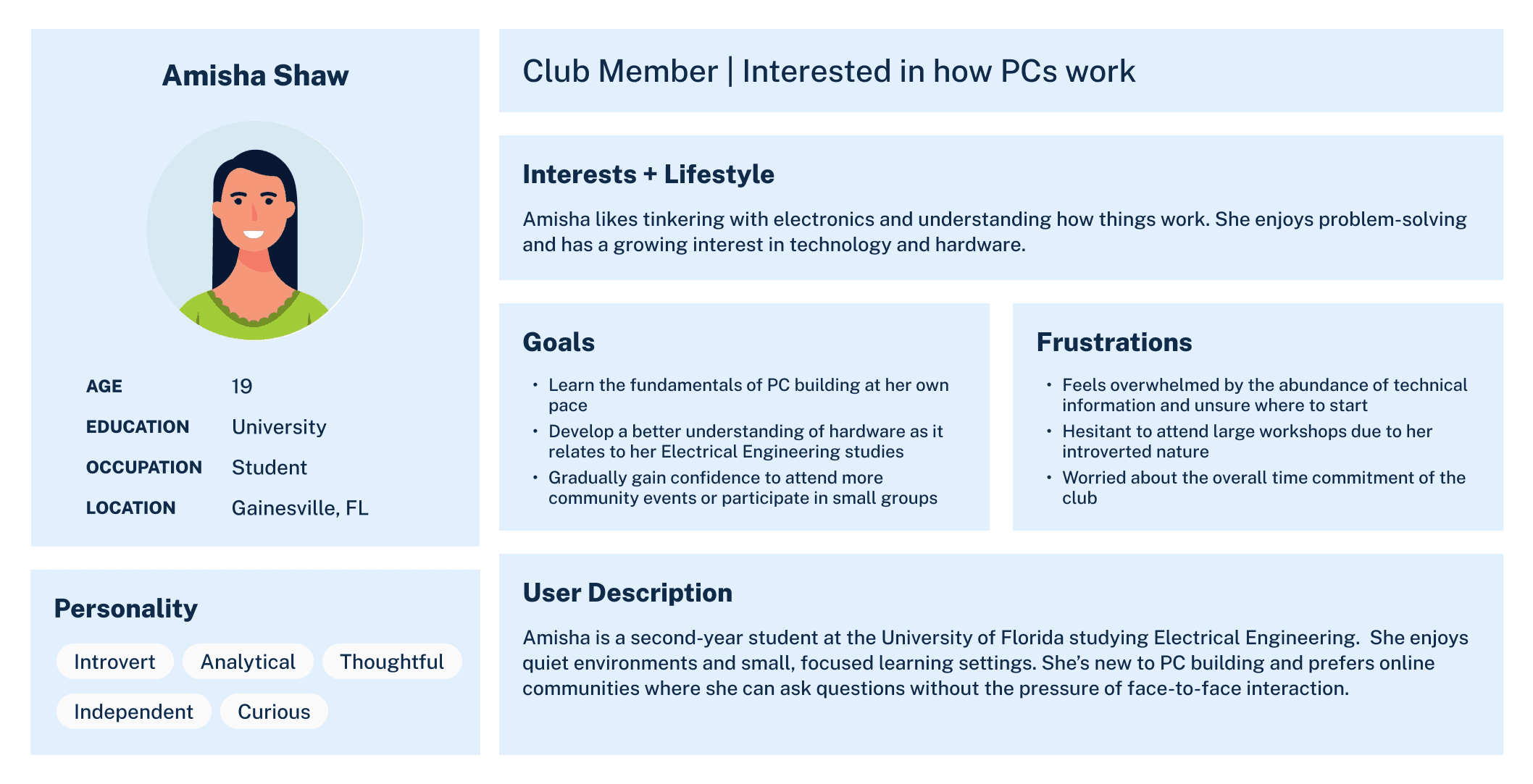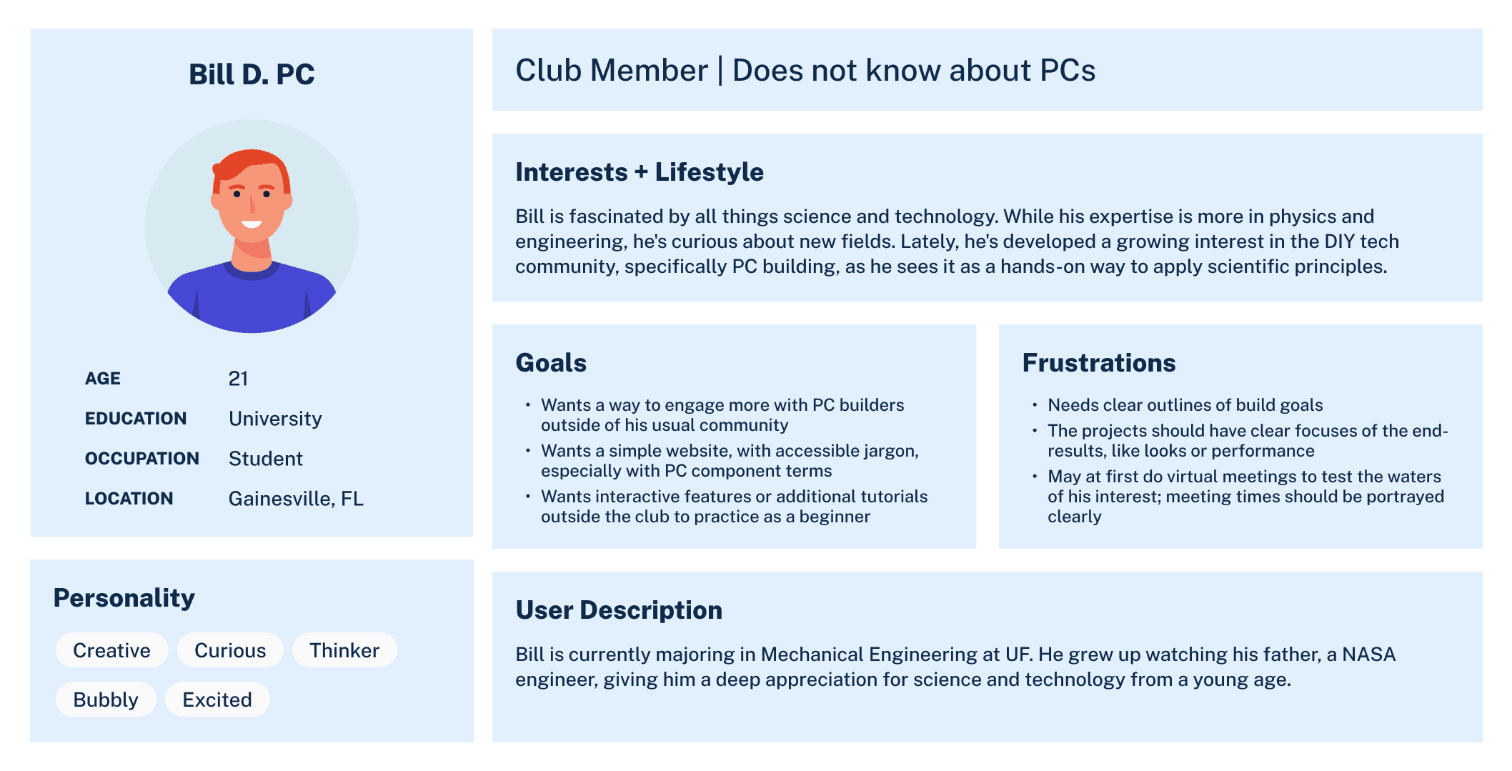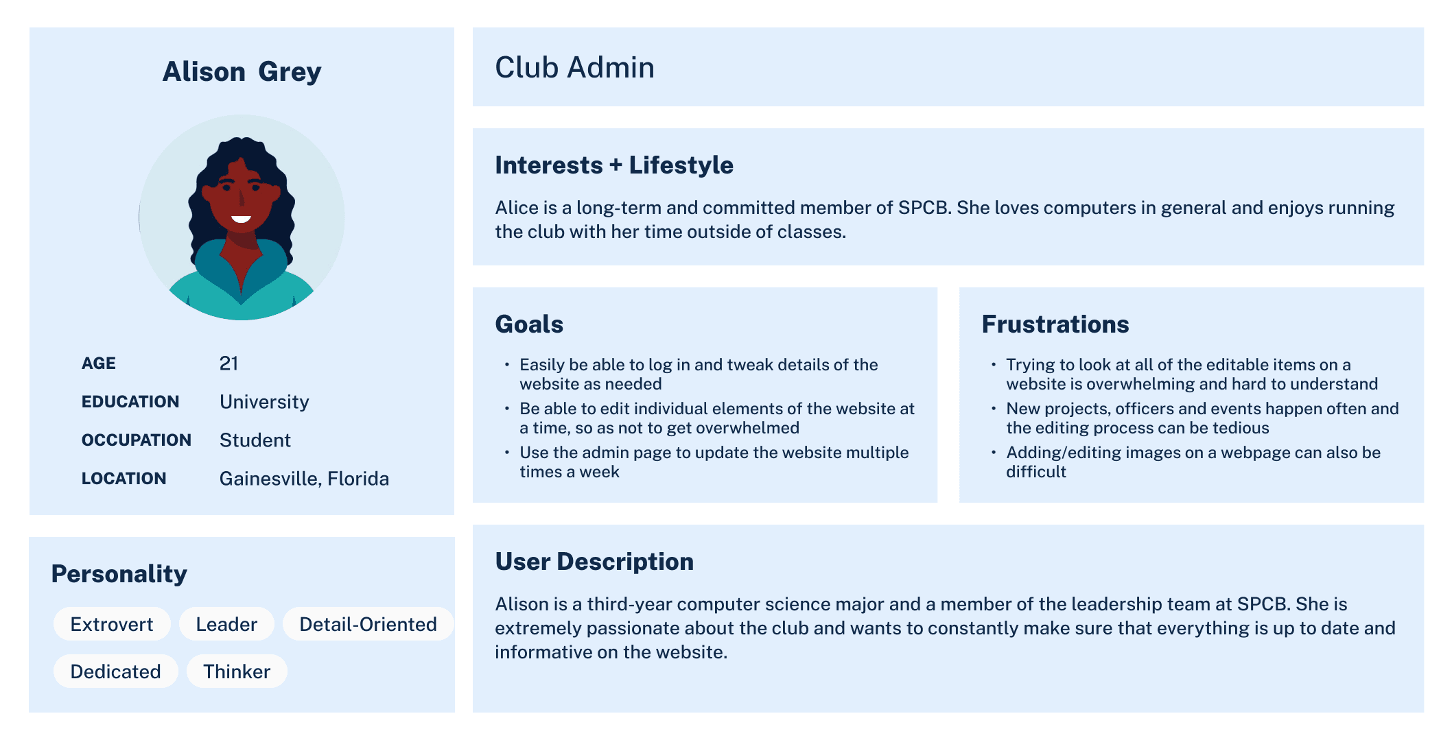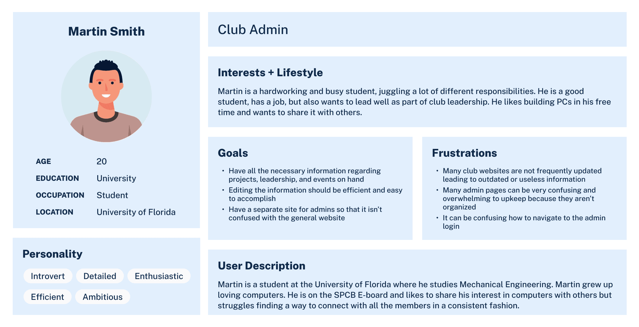 SPCB’s community brings together students from all kinds of technical backgrounds—some just curious about building PCs, others already experts. To ensure the website served everyone, we created personas that reflected different levels of skill and interest. We also designed a dedicated Admin view for SPCB’s E-Board, giving officers the tools to manage events, projects, and resources with ease.