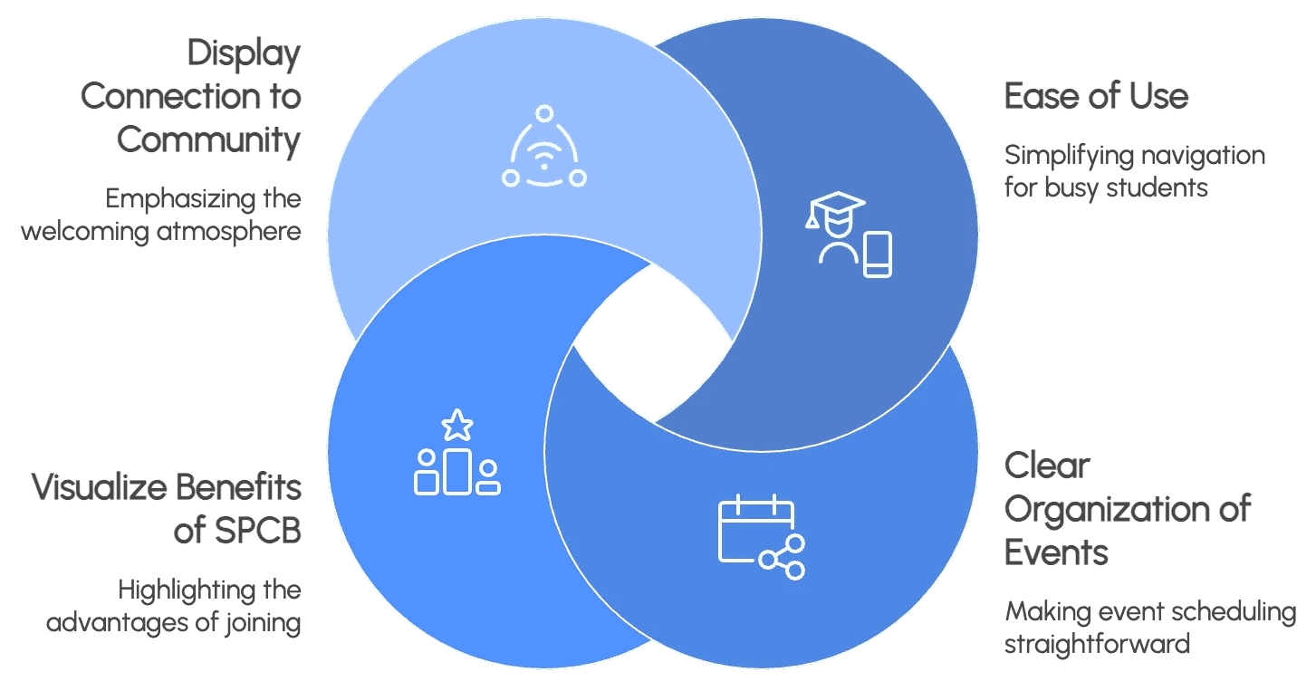 Guided by our research and user personas, we focused on four key principles to create a website that meets students where they are. We simplified navigation for ease of use, organized events clearly to fit hectic schedules, highlighted the benefits of joining SPCB, and showcased the vibrant community that makes the club unique. Every design decision was made to make engagement effortless and meaningful for both members and officers.